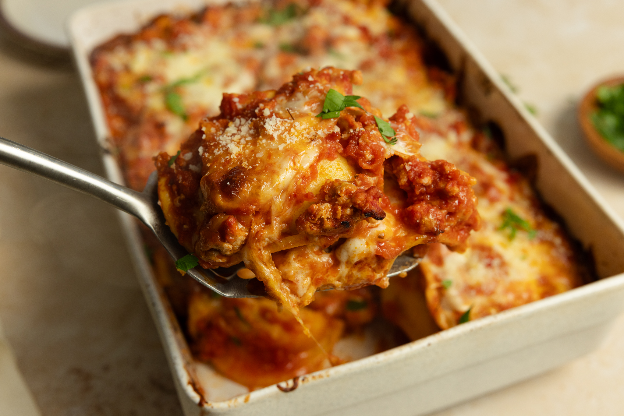 - To assemble the lasagna, spread a spoonful of the meat sauce in the bottom of a 7×11” baking dish. Add ½ of the ravioli evenly to the bottom of the pan, followed by ½ of the remaining meat sauce, and ½ of the shredded mozzarella. Repeat with one more layer of everything.
