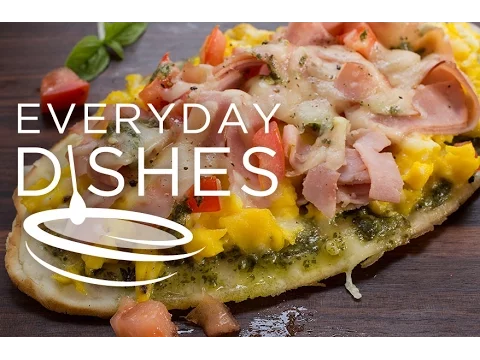 - Remove bread from oven and cover with pesto sauce, cooked eggs, ham, tomato and cheese. Return to oven and bake an additional 5–7 minutes or until cheese is hot and bubbly.