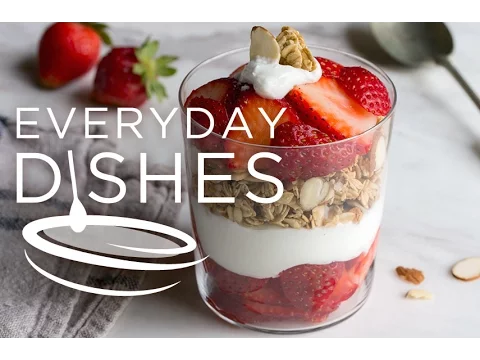 - Fill a bowl or glass with ingredients in this order: berries, yogurt sweetened with natural sweetener, rolled oats or sliced almonds and one last layer of fruit.