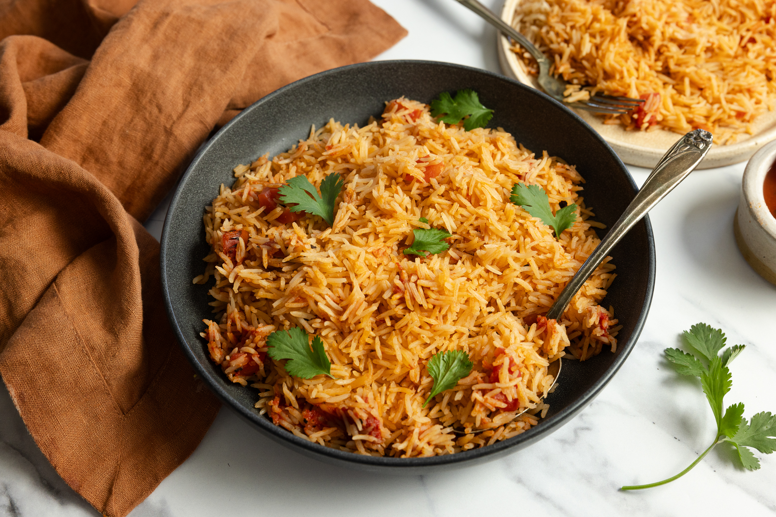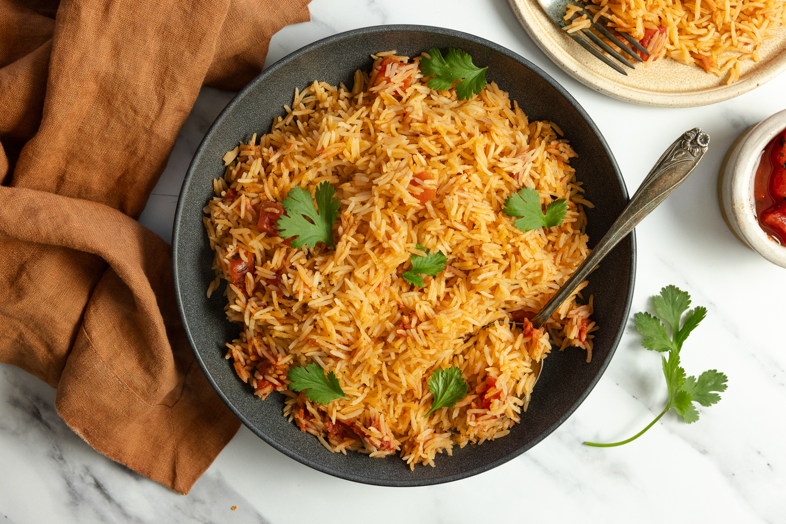 Remove the lid, discard the cilantro sprig, and fluff the rice with a fork. Serve warm with your favorite main dishes.