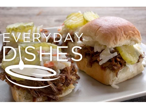 - Add meat to skillet and coat with sauce mixture. Return to slow cooker and adjust the temperature to low to keep warm. Now sit back and relax while your guests serve themselves on slider buns garnished with coleslaw and pickles.